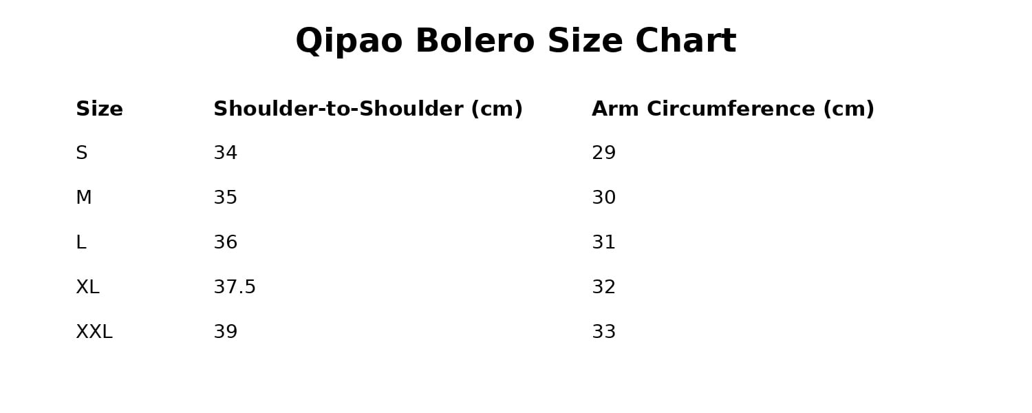 QIPAO BOLERO MEASUREMENTS S: 34cm shoulder-to-shoulder, 29cm arm M: 35cm shoulder-to-shoulder, 30cm arm L: 36cm shoulder-to-shoulder, 31cm arm XL: 37.5cm shoulder-to-shoulder, 32cm arm XXL: 39cm shoulder-to-shoulder, 33cm arm To order: All pieces can be bought separately or in a full set.